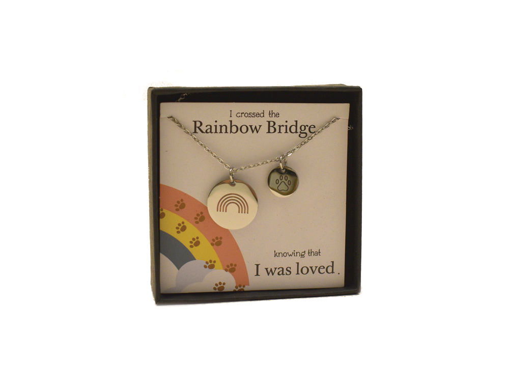 This necklace features both rainbow and paw print pendants. A delicate looking necklace to remember your special friend.